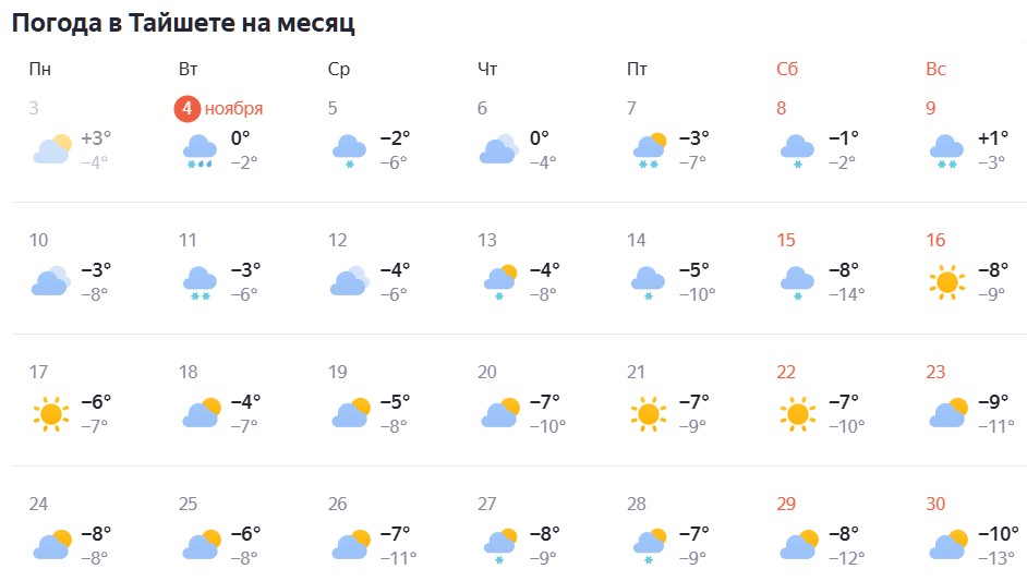 Согласно долгосрочному прогнозу, ноябрь 2025 года в Тайшете станет типичным предзимьем: он начнется с околонулевых температур и завершится устойчивыми морозами. Основными чертами месяца станут высокая влажность, пасмурная погода и пронизывающий ветер, который будет создавать ощущение более сильного холода.