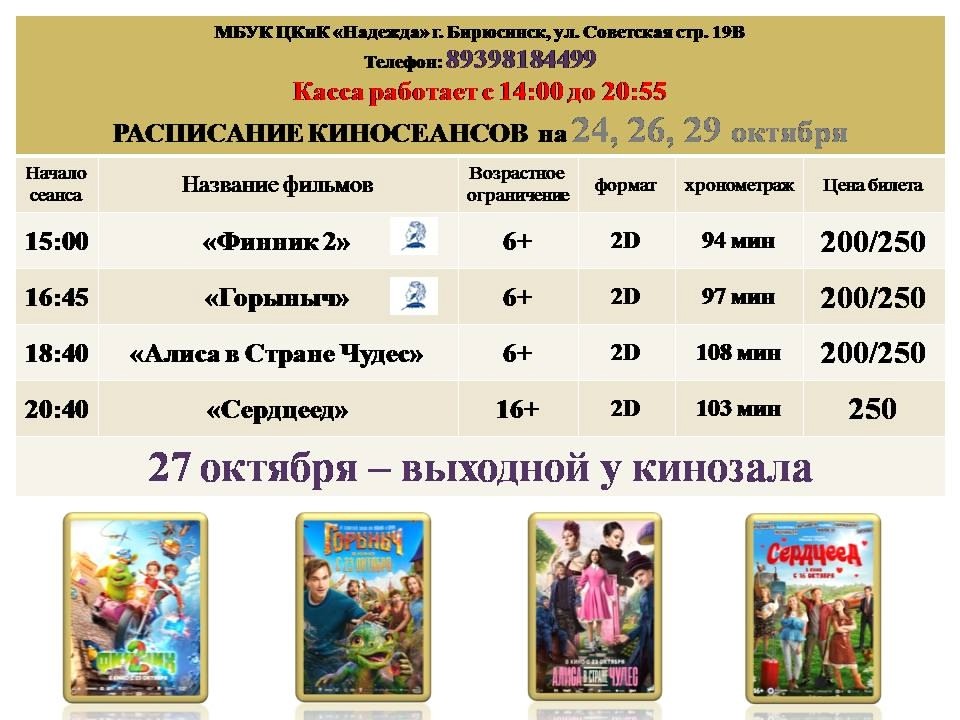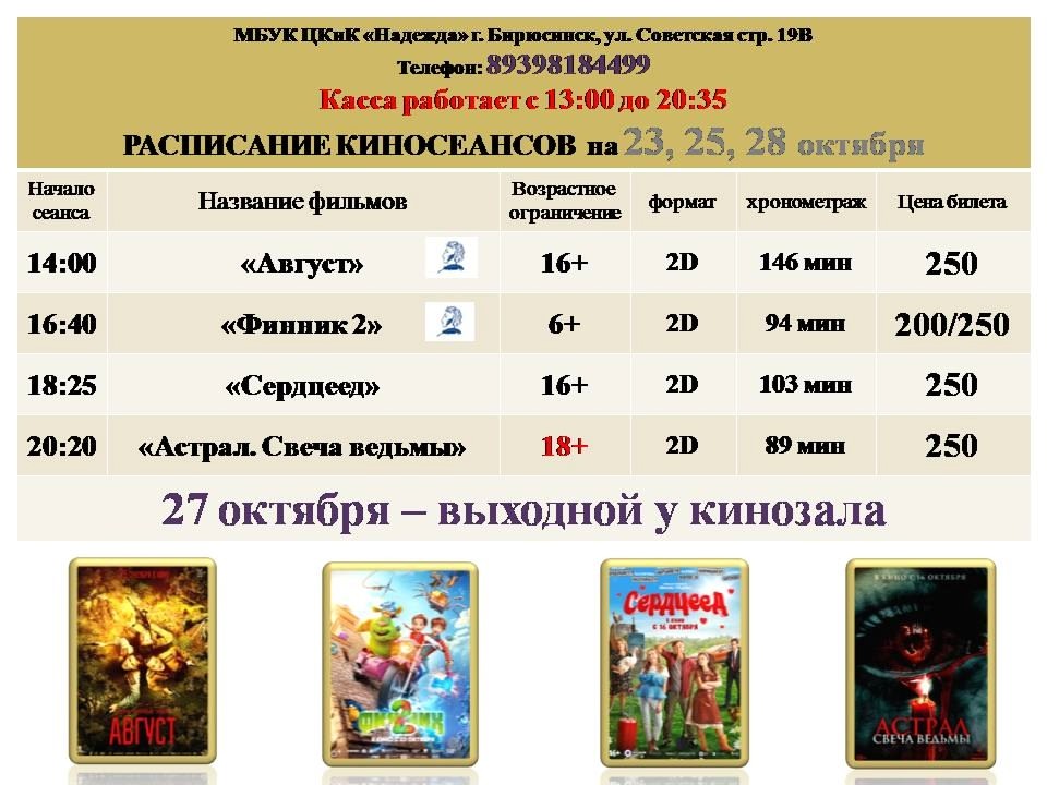 Центр культуры и кино «Надежда» Бирюсинска представил афишу кинопоказов на 23-29 октября (6+).