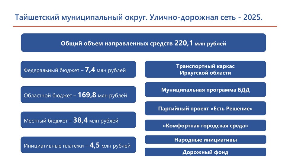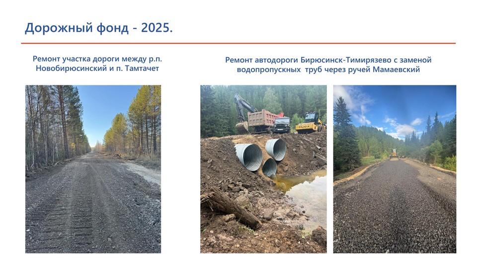 В 2025 году на ремонт дорог в Тайшетском муниципальном округе было потрачено 220 миллионов рублей. За эти деньги отремонтировано 44,5 километра дорог, в том числе более 8,5 км в асфальтобетонном исполнении и 36 км в песчано-гравийном.