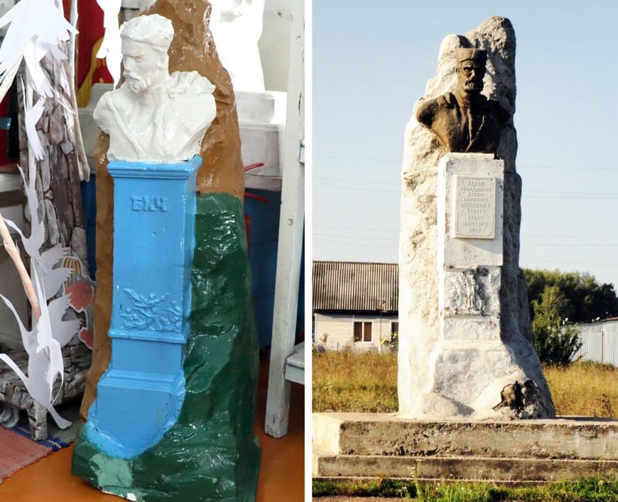 Справа на снимке – памятник комиссару партизан Шиткинского фронта Ивану Андреевичу Бичу-Таёжному, который ныне расположен напротив школы №23. Слева – очень похожая скульптура высотой около метра, которую мы вчера неожиданно повстречали в школьном музее белорусского села Черчет на севере Тайшетского района.