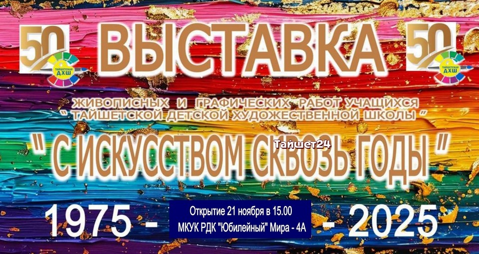 21 ноября Тайшетская детская художественная школа отметит свой 50-летний юбилей. В честь этого знаменательного события будет организована большая ретроспективная выставка «С искусством сквозь годы». На ней можно будет увидеть более 150 работ учащихся школы — с 1975 года по сегодняшний день.