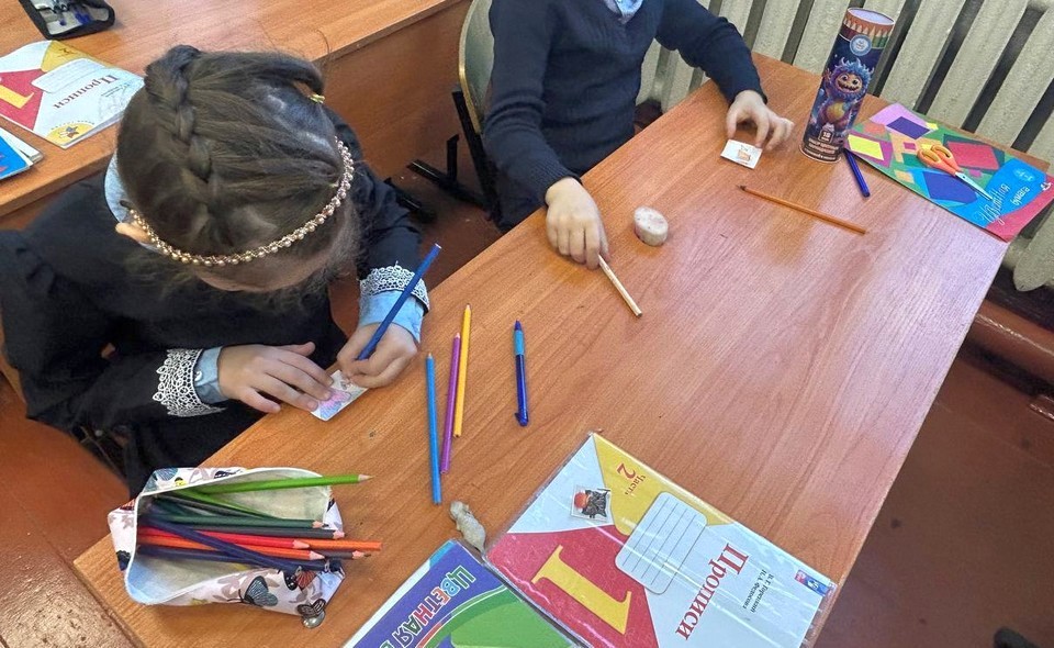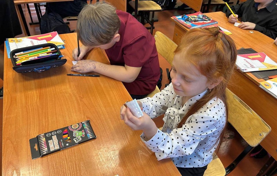 После профилактической беседы дети сами изготовили световозвращающие элементы. Каждому ученику раздали специальную светоотражающую пленку, на которой ребята нарисовали различные фигуры, а затем вырезали их.