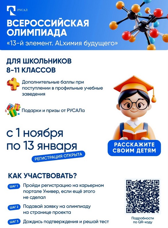 Компания РУСАЛ информирует о старте юбилейного, XV сезона Всероссийской олимпиады школьников «13-й элемент. ALхимия будущего».