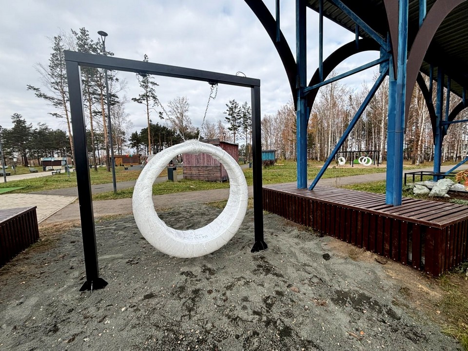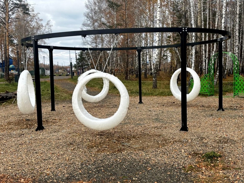 Уже появились и новые арт-объекты — две конструкции со светящимися качелями в виде колец. Одну установили при входе, а вторую, состоящую из пяти колец, — рядом с декоративной аркой.