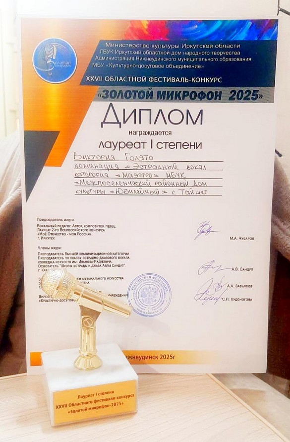 Культорганизатор Дома культуры «Юбилейный» Виктория Голято и солист народного вокального ансамбля «Калина красная» Валерий Трушин приняли участие в «Золотом микрофоне» впервые. По результатам конкурса им было присуждено звание лауреатов I степени!