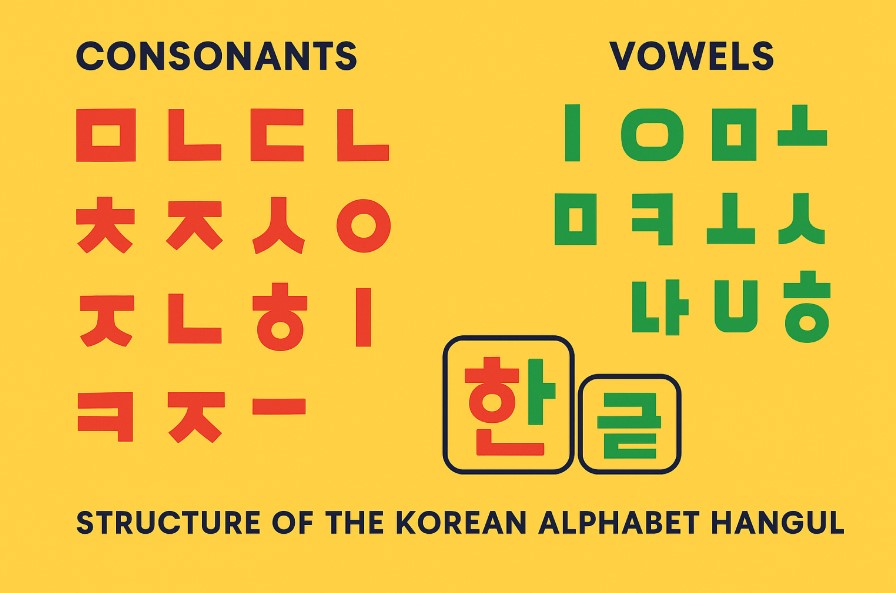 Алфавит состоит из 24 основных букв: 14 согласных и 10 гласных. Фишка в том, что буквы объединяются в слоги, которые визуально вписываются в квадрат. Например, слово «хангыль» состоит из двух слогов: 한 (хан) и 글 (гыль).