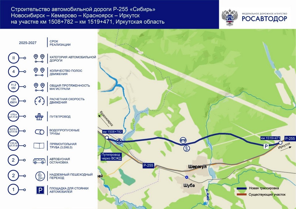 Кроме того, новая дорога позволит существенно снизить нагрузку на центральную улицу села Шерагул, по которой сейчас проходит трасса Р-255 «Сибирь».