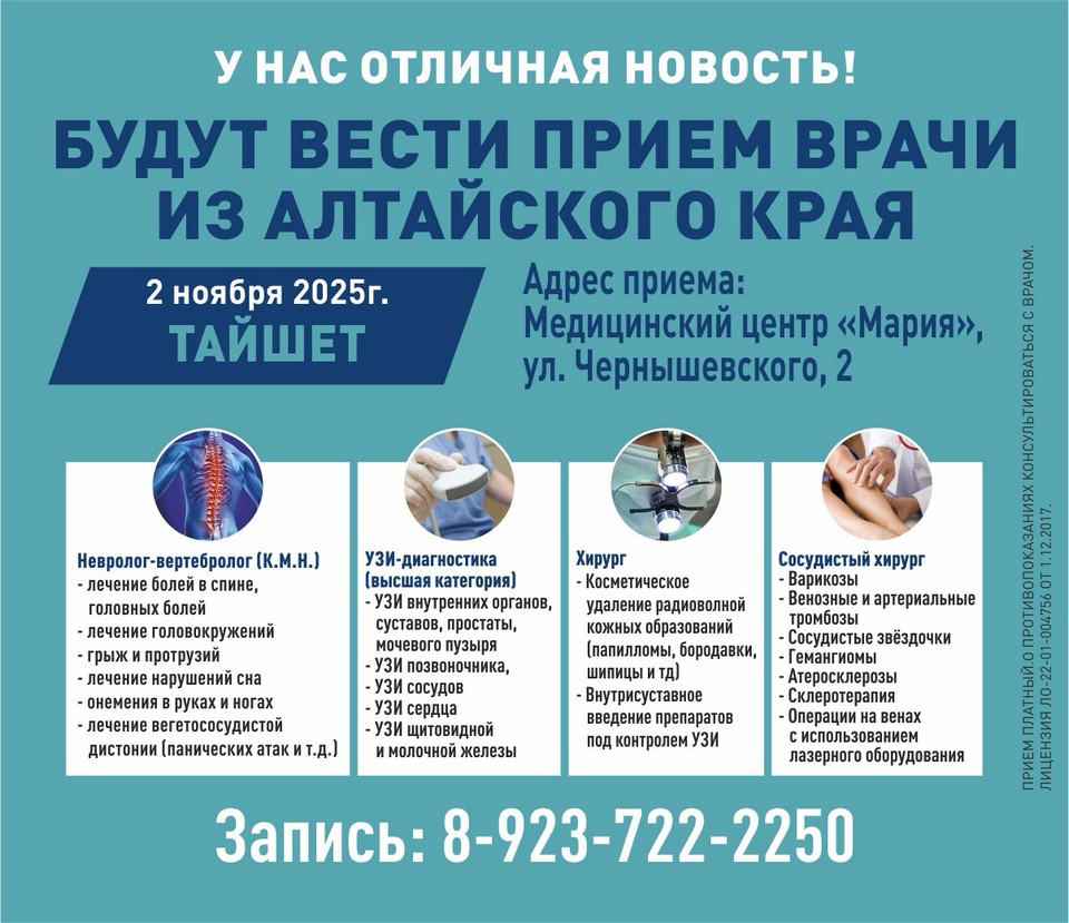 2 ноября 2025 года в Тайшете по адресу: улица Чернышевского, 2 (медицинский центр «Мария») будут вести приём врачи из Алтайского края.