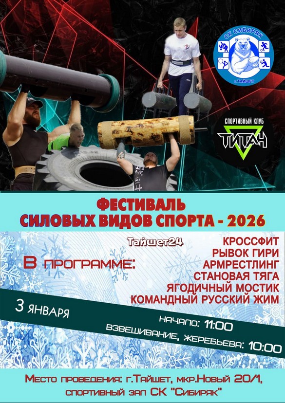 Спортсменов приглашают принять участие в фестивале силовых видов спорта, который пройдёт в СК «Сибиряк» в Тайшете 3 января. Начало в 11:00.