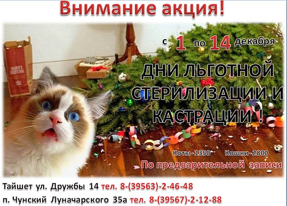 Тайшетская станция по борьбе с болезнями животных объявляет акцию по льготной стерилизации и кастрации с 1 по 14 декабря:
