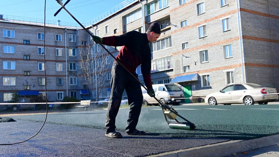 Начали с укладки резинового покрытия. Затем установят волейбольные стойки с сеткой, ворота для мини-футбола и баскетбольные щиты, а также нанесут разметку.