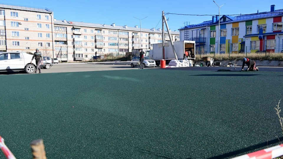 В Тайшете укладывают резиновое покрытие для будущей спортплощадки