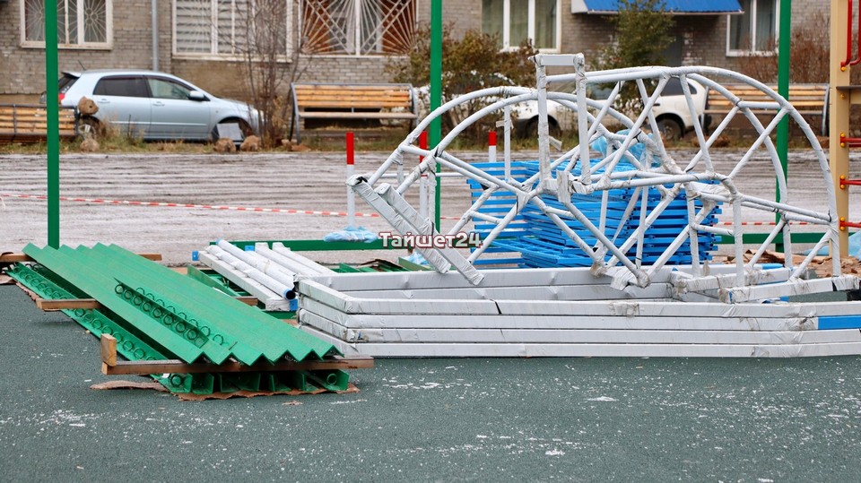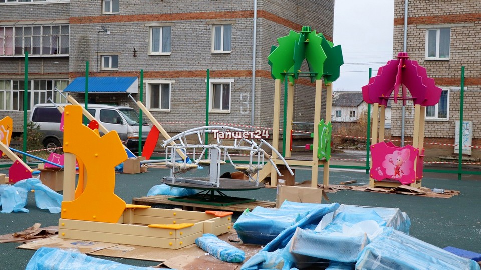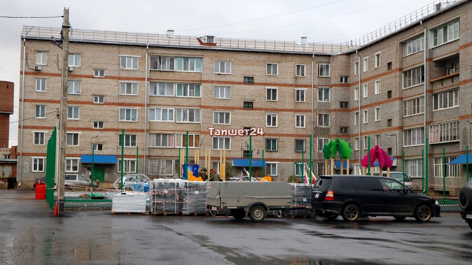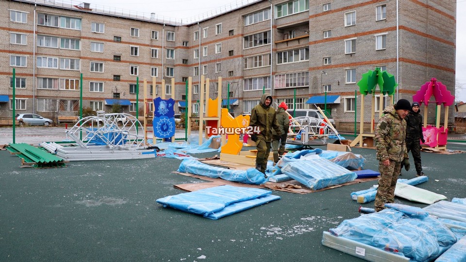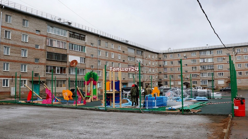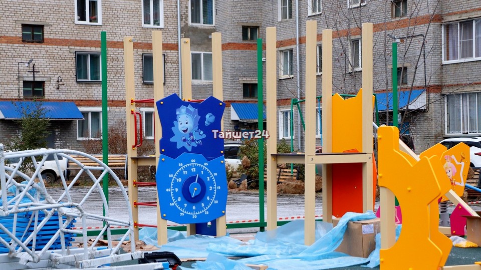 Во дворе домов №3 и 5 по улице Зои Космодемьянской в Тайшете кипит работа. Здесь устанавливают элементы детской игровой площадки, которая выполнена в тематике мультфильма «Фиксики».