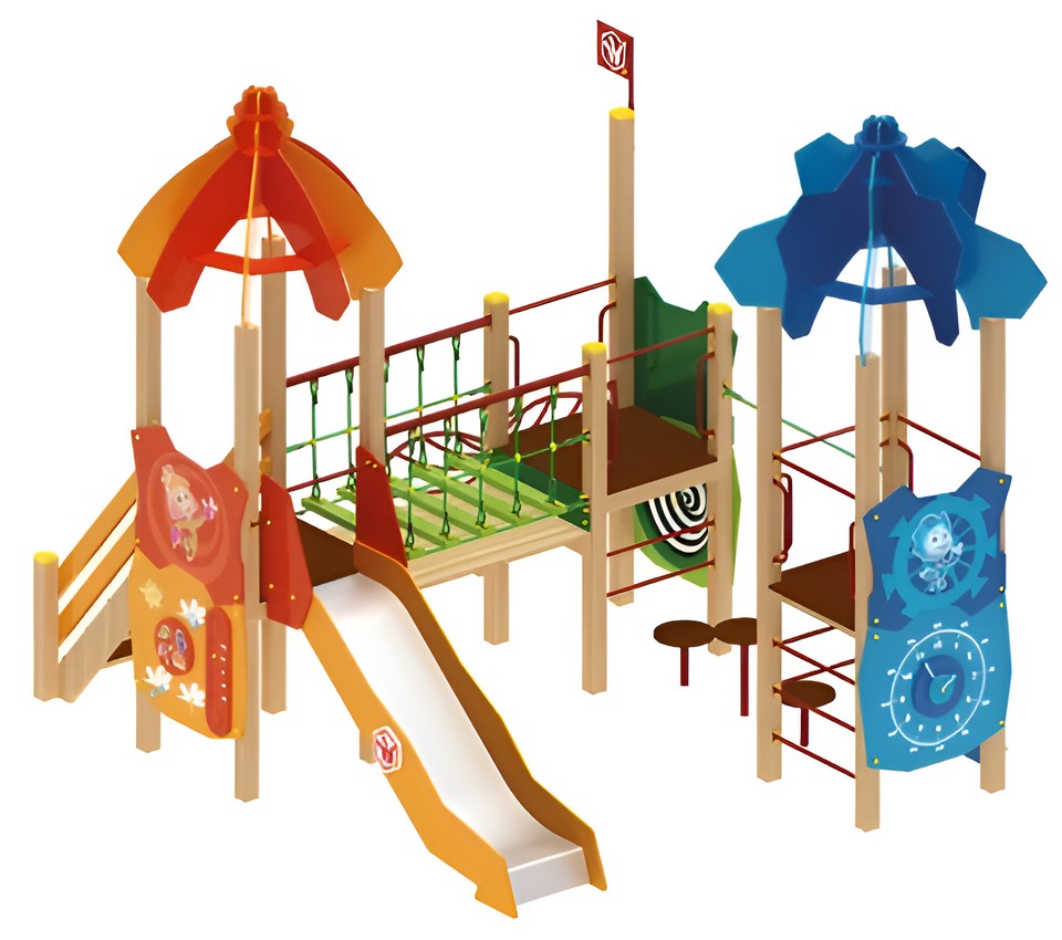 Детская площадка будет выполнена в тематике мультфильма «Фиксики». Она будет состоять из песочного комплекса, качалки на пружине, интерактивной панели, качели и игрового комплекса.