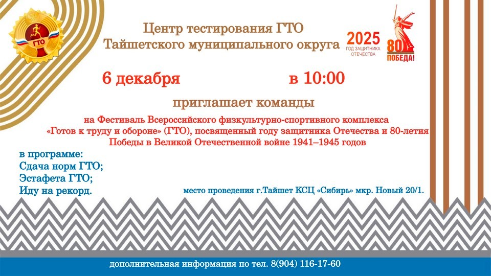 В Тайшете 6 декабря в спорткомплексе «Сибирь» (микрорайон Новый, 20/1) пройдет Фестиваль Всероссийского физкультурно-спортивного комплекса ГТО.